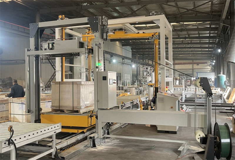 木箱貨物-搖臂式纏膜機+垂直打帶